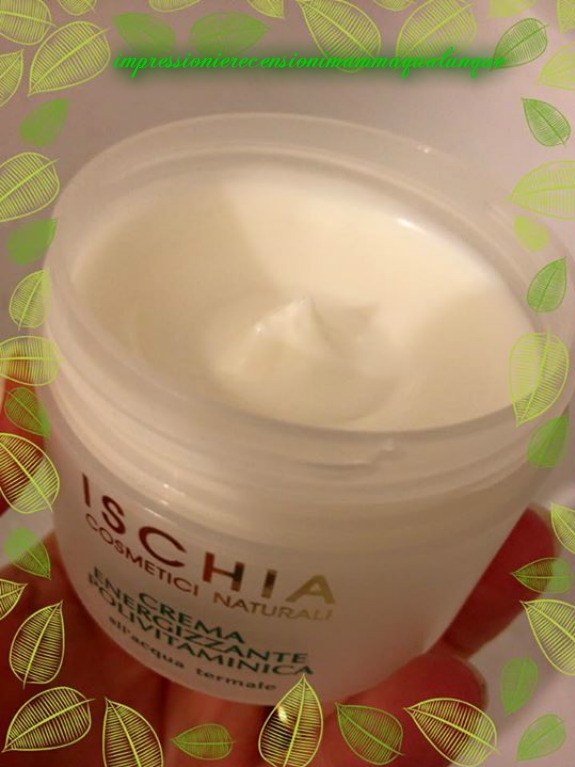 Subito dopo ho applicato il secondo prodotto, la Crema energizzante Polivitaminica con acqua termale, vitamine A-C-E-F, olio di germe di grano ed olio di mandorle dolci. Particolarmente indicata per pelli stanche e spente, si presenta con una consistenza densa e corposa, un odore delicato e un colore neutro.